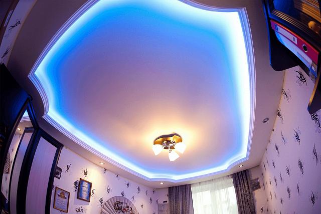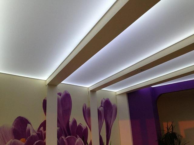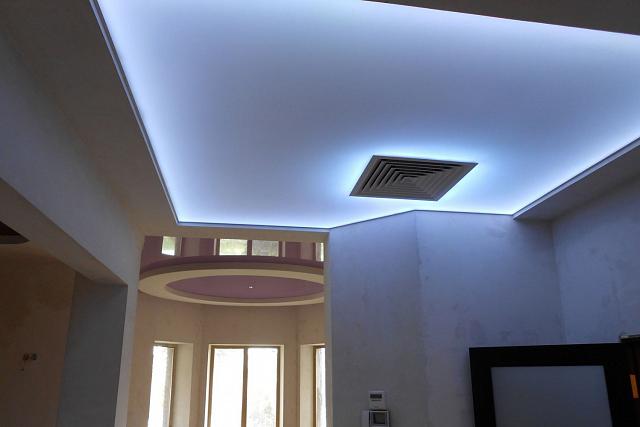 Освещение под потолком появляется благодаря светодиодной ленте которая располагается по всему периметру помещения. Толщина ленты составляет 2-3 мм, а ширина 8-10.