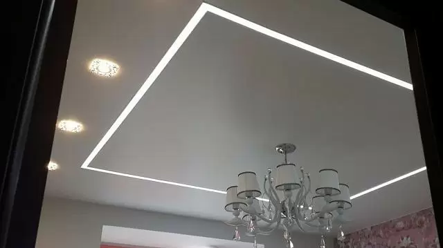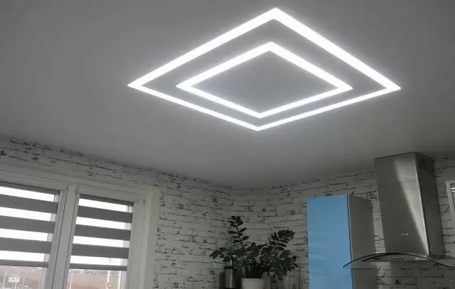 С помощью светящихся полос на потолке можно подчеркнуть основные элементы интерьера и разделить пространство на функциональные зоны. Для этого используются специальные профили со светопропускающей крышкой или без неё. Внутри профиля размещается светодиодная лента, а сам профиль устанавливается вровень с натяжным потолком.
