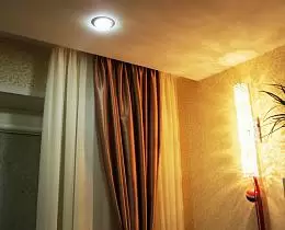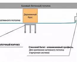 Существует два варианта крепления потолочного карниза. Это потолочный карниз или ниша под карниз. Потолочный карниз крепиться к установленной закладной под натяжным потолком. В случае ниши под карниз, потолок не доходит до окна, оставляется пространство и в это пространство крепится карниз. Выглядит это так, как будто шторы спускаются из-под потолка.